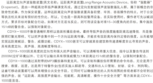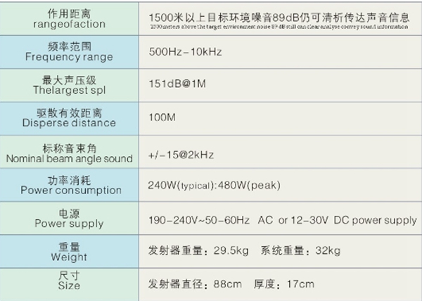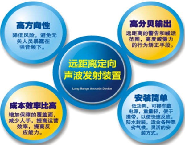 與傳統(tǒng)的擴(kuò)音系統(tǒng)比較,遠(yuǎn)距離定向聲波發(fā)射裝置是一種革命性的新技術(shù)。它具有非常的遠(yuǎn)射功力,可以將聲音信息清晰地傳遞到數(shù)百米以外,甚至能穿越某些建筑物;它具有強(qiáng)大的震懾威力,可以逼迫受眾自動(dòng)離開(kāi)禁入?yún)^(qū)域;它具有精準(zhǔn)的定向能力,可以瞄準(zhǔn)一定角度發(fā)射難以承受的刺激性聲波,而在其它角度卻無(wú)不適。